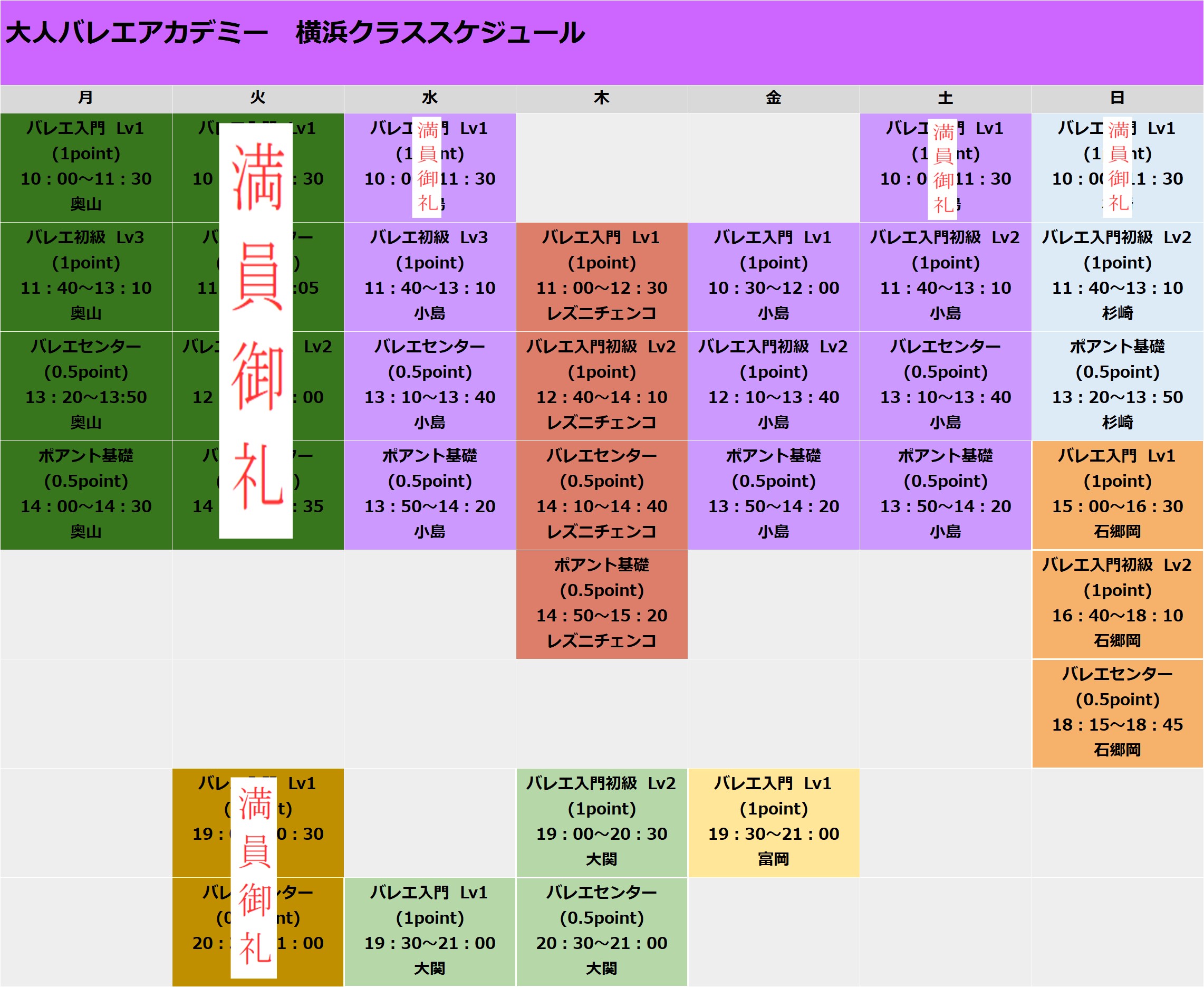 ※下記の満員御礼のクラスは体験を受け付けておりません。